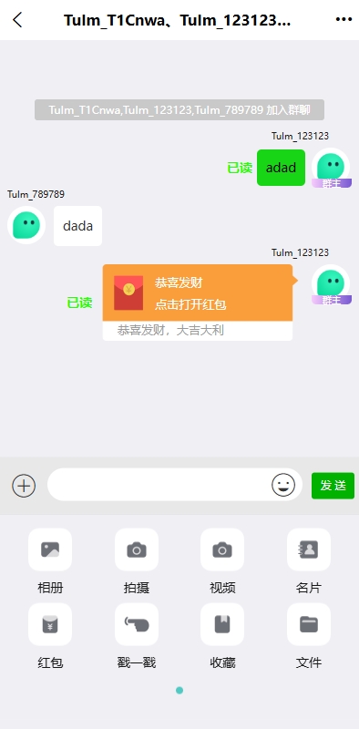 群聊:快速实现群组聊天,单人禁言、全员禁言、群红包、设置管理员、踢群成员等灵活的群组成员和权限管理。