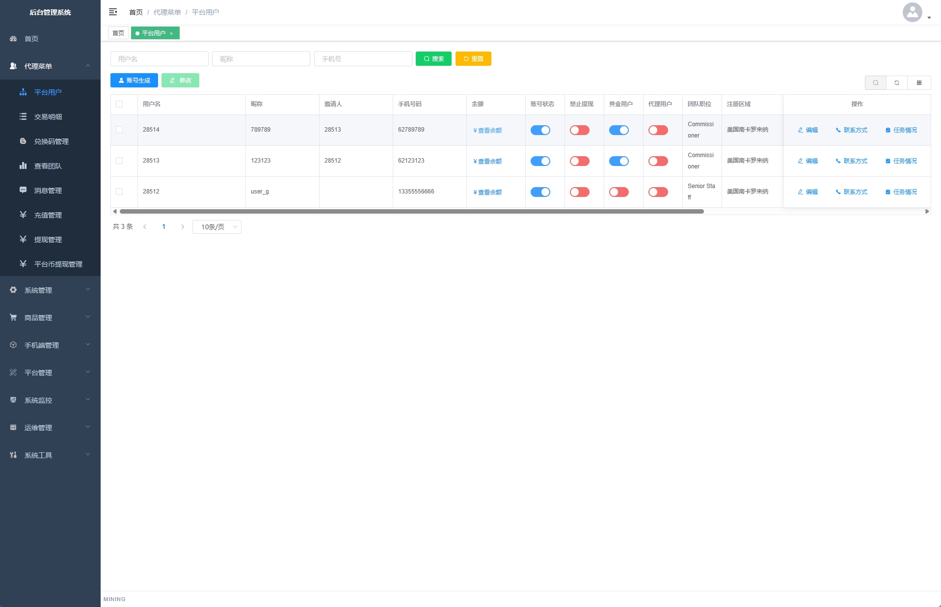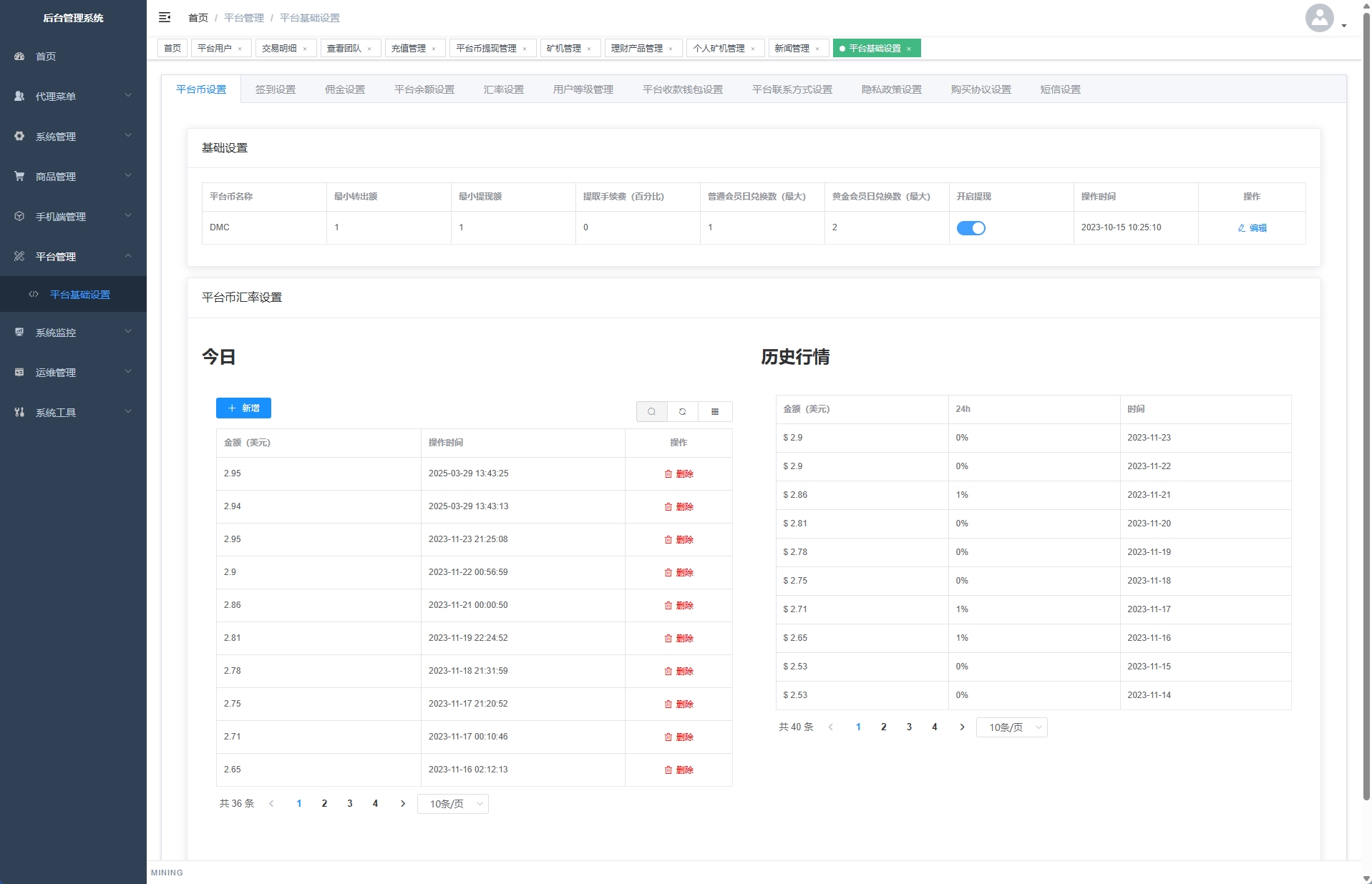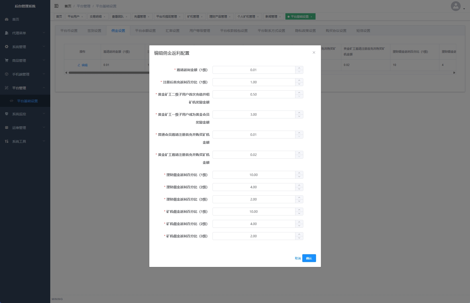 系统功能:矿机租聘、平台币质押、三级分销等功能