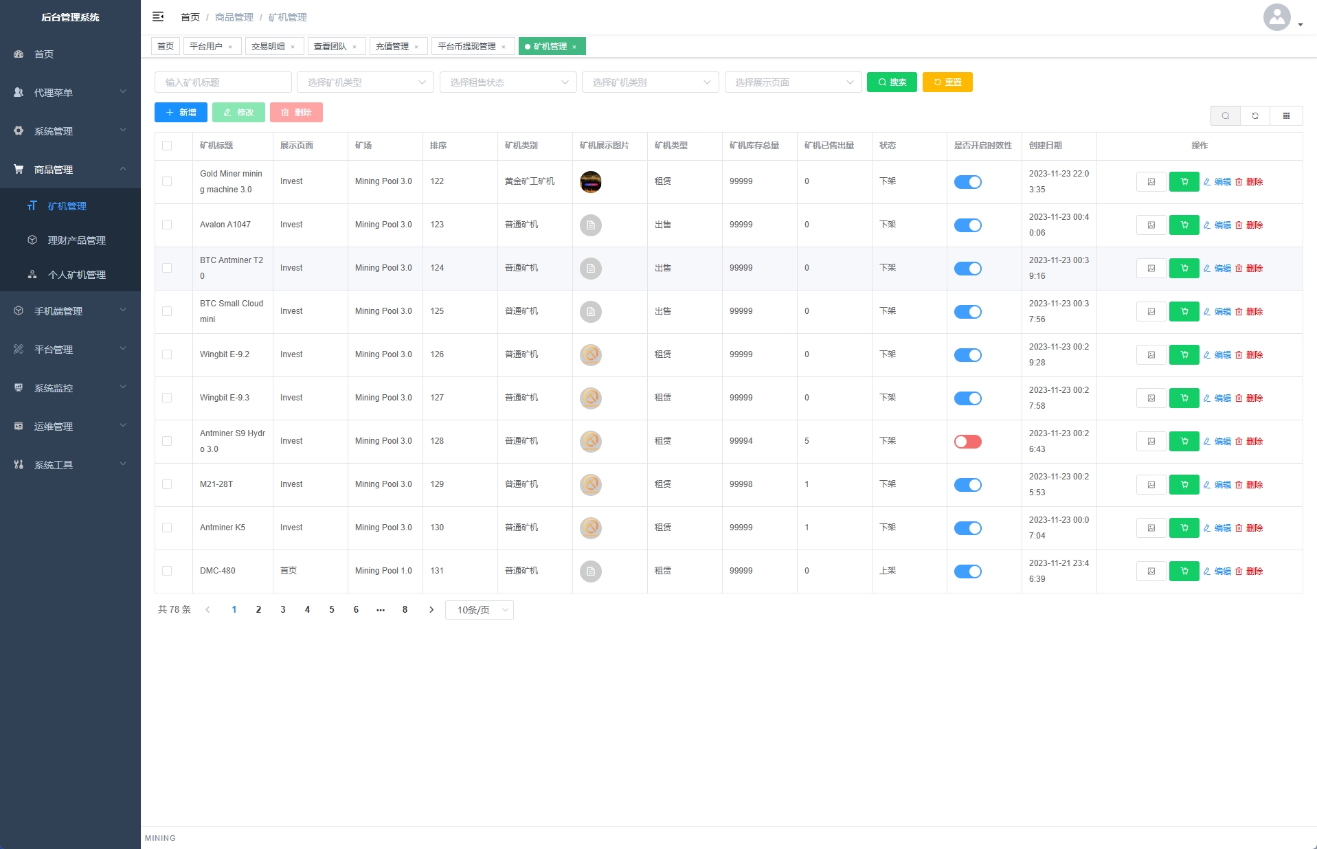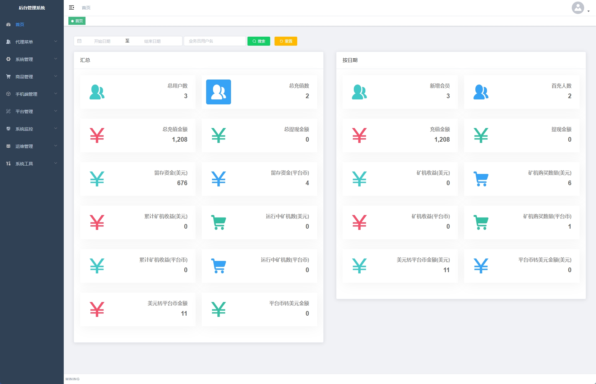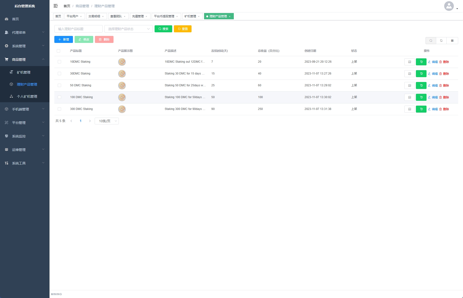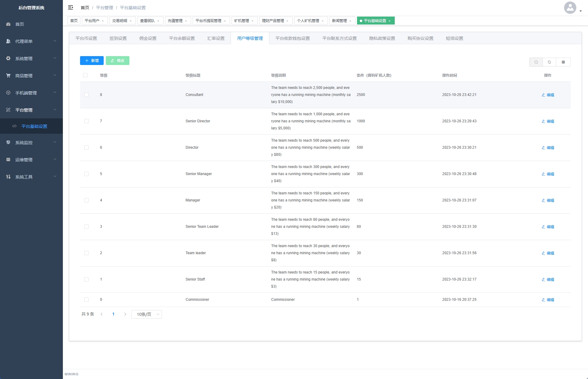 系统功能:矿机租聘、平台币质押、三级分销等功能