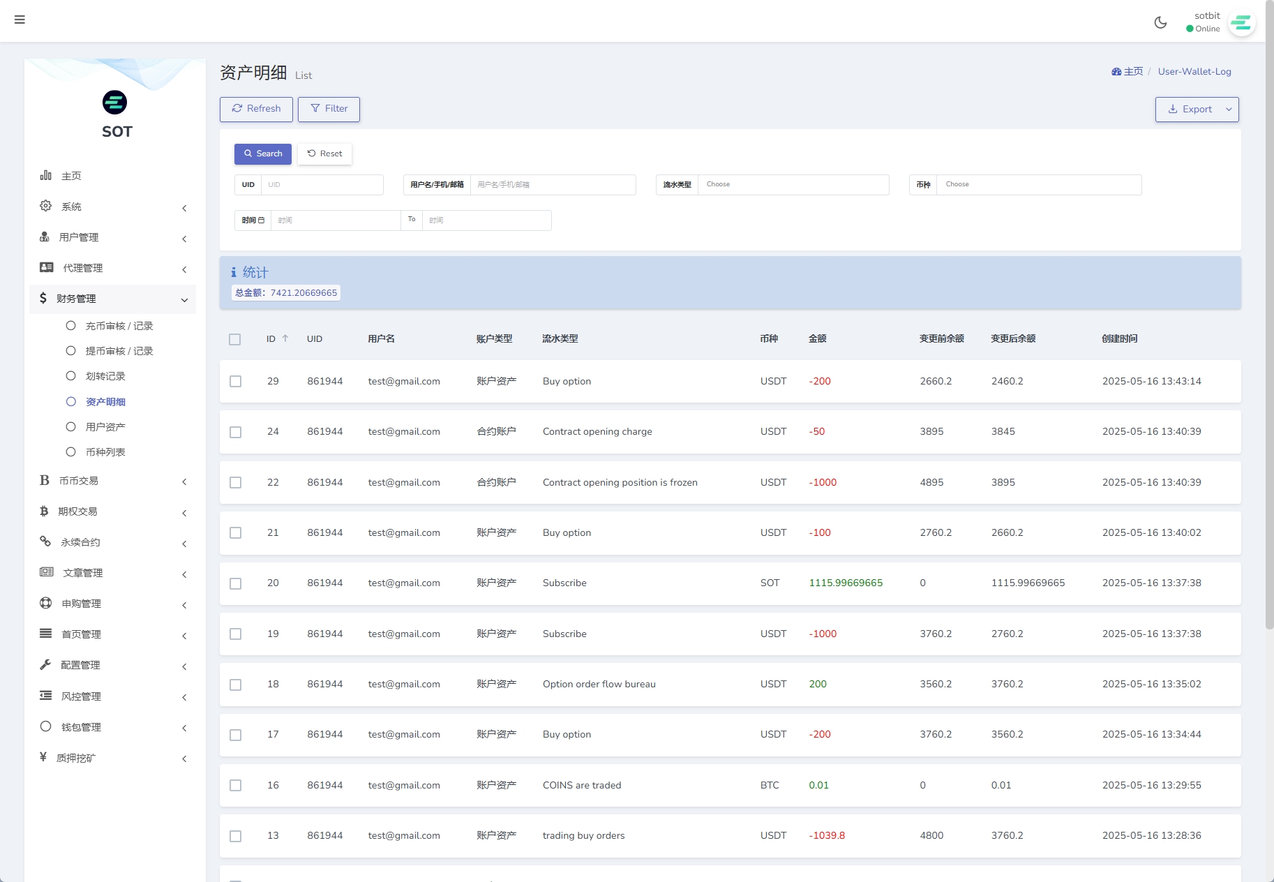 3、钱包管理(用户钱包管理、资金调节、钱包日志、转入转出记录)